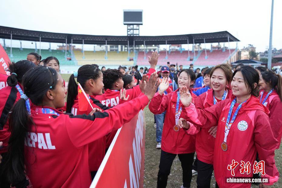 1月31日,第三届“贺岁杯”中尼友谊足球赛在尼泊尔首都加德满都举行,比赛在中国云南女子青年队与尼泊尔女子青年队之间展开。双方本着“友谊第一,比赛第二”的精神在场上拼搏。图为中尼两国女足队员在颁奖仪式后击掌互动。中新社记者 崔楠 摄