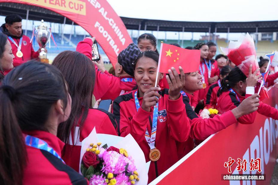 1月31日,第三届“贺岁杯”中尼友谊足球赛在尼泊尔首都加德满都举行,比赛在中国云南女子青年队与尼泊尔女子青年队之间展开。双方本着“友谊第一,比赛第二”的精神在场上拼搏。图为尼泊尔女足队员向队友展示手中的五星红旗。中新社记者 崔楠 摄