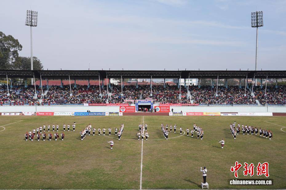 1月31日,第三届“贺岁杯”中尼友谊足球赛在尼泊尔首都加德满都举行,比赛在中国云南女子青年队与尼泊尔女子青年队之间展开。双方本着“友谊第一,比赛第二”的精神在场上拼搏。图为尼泊尔武装警察部队乐团在赛前演出中拼出“CHINA”字样。中新社记者 崔楠 摄